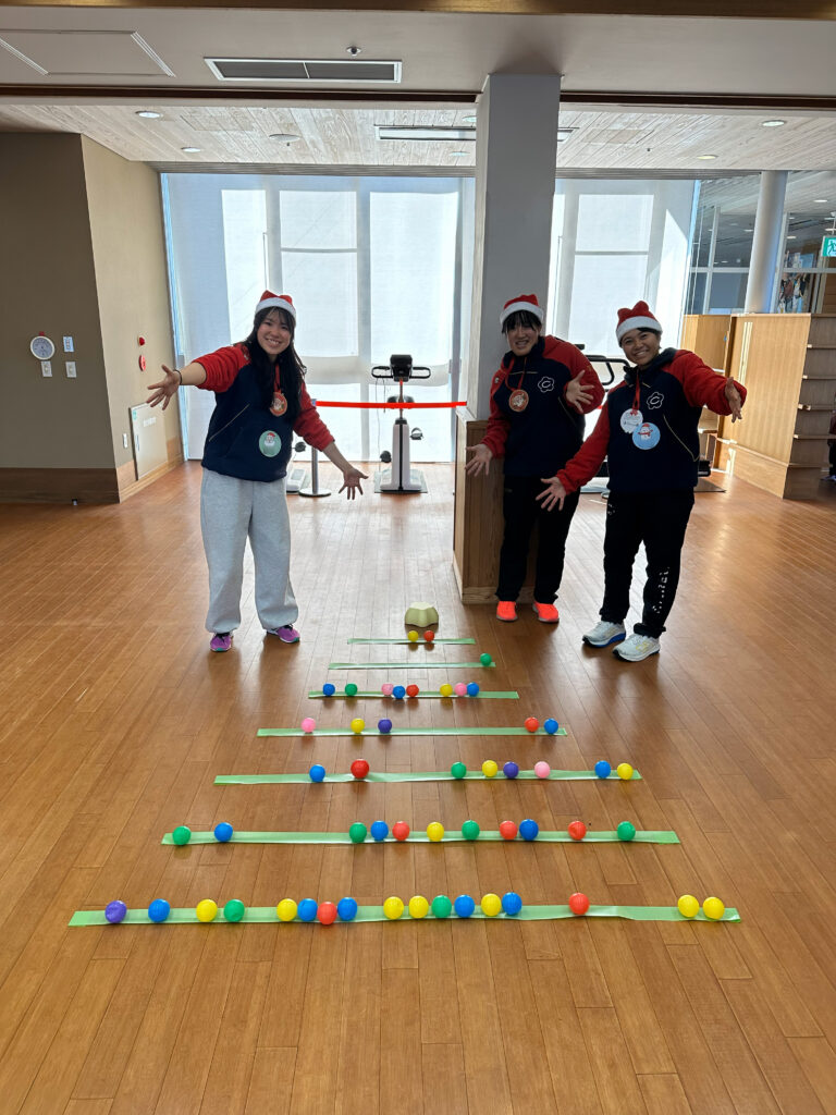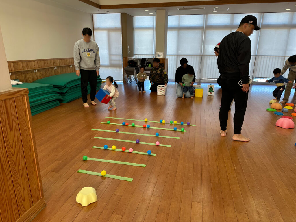 また、色の識別やボールコントロールを目的としたボール運動にも親子で取り組み、最後はみんなでクリスマスツリー🎄にボールを使って飾り付けをしました。